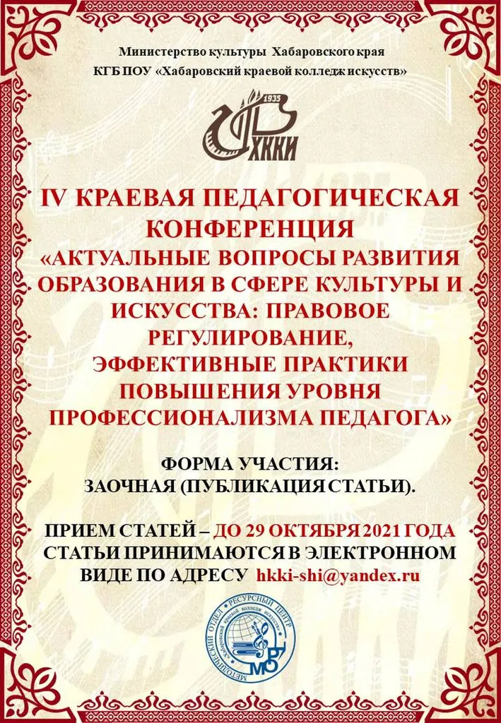 Администрация КГБ ПОУ «Хабаровский краевой колледж искусств» приглашает Вас принять участие (заочно – публикация статей) в IV Краевой педагогической конференции «Актуальные вопросы развития образования в сфере культуры и искусства: правовое регулирование, эффективные практики повышения уровня профессионализма педагога».