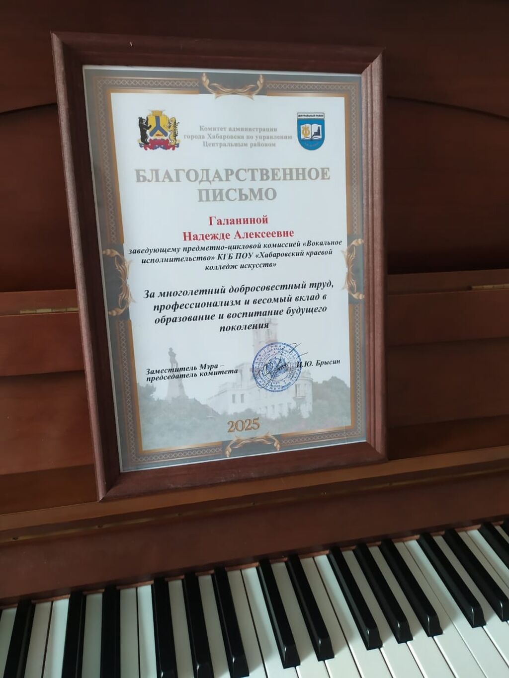 На торжественном собрании, проведенном мэрией г. Хабаровска, посвященном Дню учителя, прошло чествование педагогических работников. Все они внесли значительный вклад в развитие образования и воспитания молодого поколения. Мы рады, что администрация г. Хабаровска поздравила нашего преподавателя, зав. ПЦК "Вокальное искусство" Галанину Надежду Алексеевну. Надежда Алексеевна активно выступает и проводит многочисленные концерты камерной вокальной музыки со студентами на площадках нашего города. Выпускает плеяду талантливых учеников, которые поступают в ведущие вузы нашей страны. В 2025 году у Надежды Алексеевны выпустилась с отличием - Анна Ференцева, которая продолжила свой путь уже в Нижегородской консерватории. Выпускница 2023 года Заремская Виктория Витальевна преподает в нашем колледже и развивает творческий потенциал студентов. Поздравляем Галанину Надежду Алексеевну с получением заслуженной грамоты! Вы - пример профессионализма и преданности своему делу!