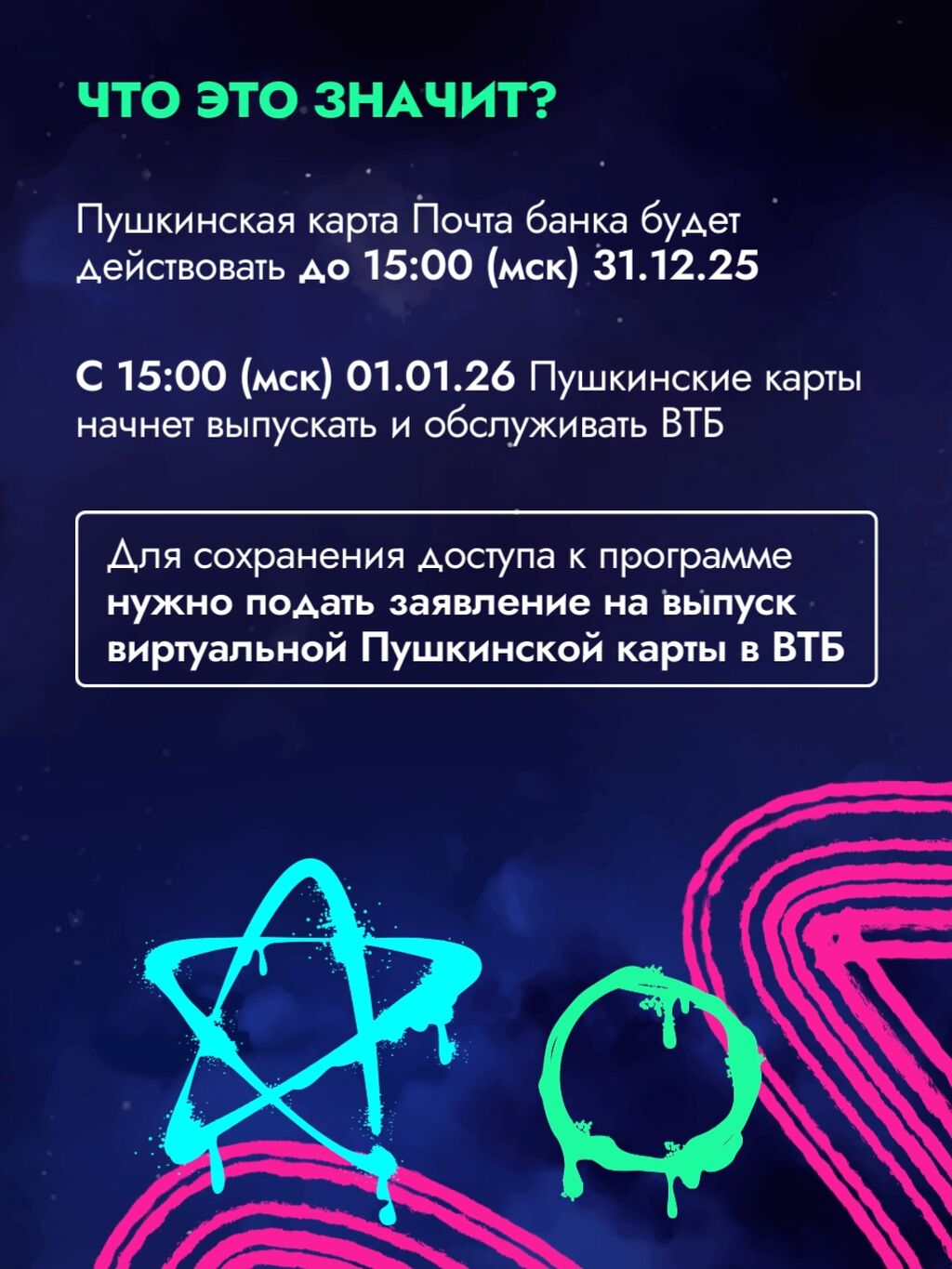 Напоминаем, что с 1 января банком-оператором программы «Пушкинская карта» будет ВТБ.