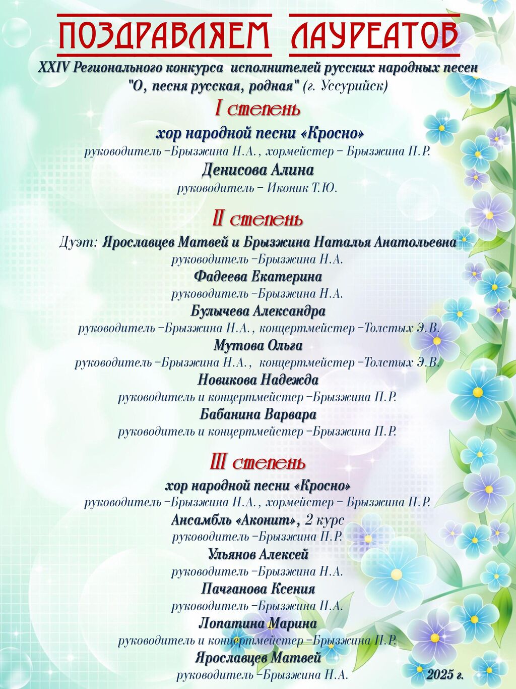 Поздравляем лауреатов XXIV Регионального конкурса исполнителей русских народных песен "О, песня русская, родная"
