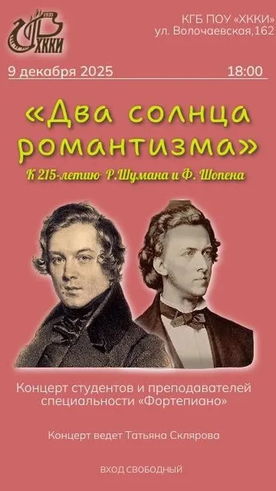В честь 215-летия со дня рождения Роберта Шумана и Фредерика Шопена 09.12.2025г. в Большом зале краевого колледжа искусств по адресу: г. Хабаровск, ул. Волочаевская, д. 162 в 18.00 состоится концерт студентов и преподавателей специальности "Фортепиано" "Два солнца романтизма". Присоединяйтесь к нашему музыкальному празднику, где прозвучат произведения великих композиторов. Ведет концерт - Татьяна Склярова. Вход свободный. Ждём всех любителей музыки!