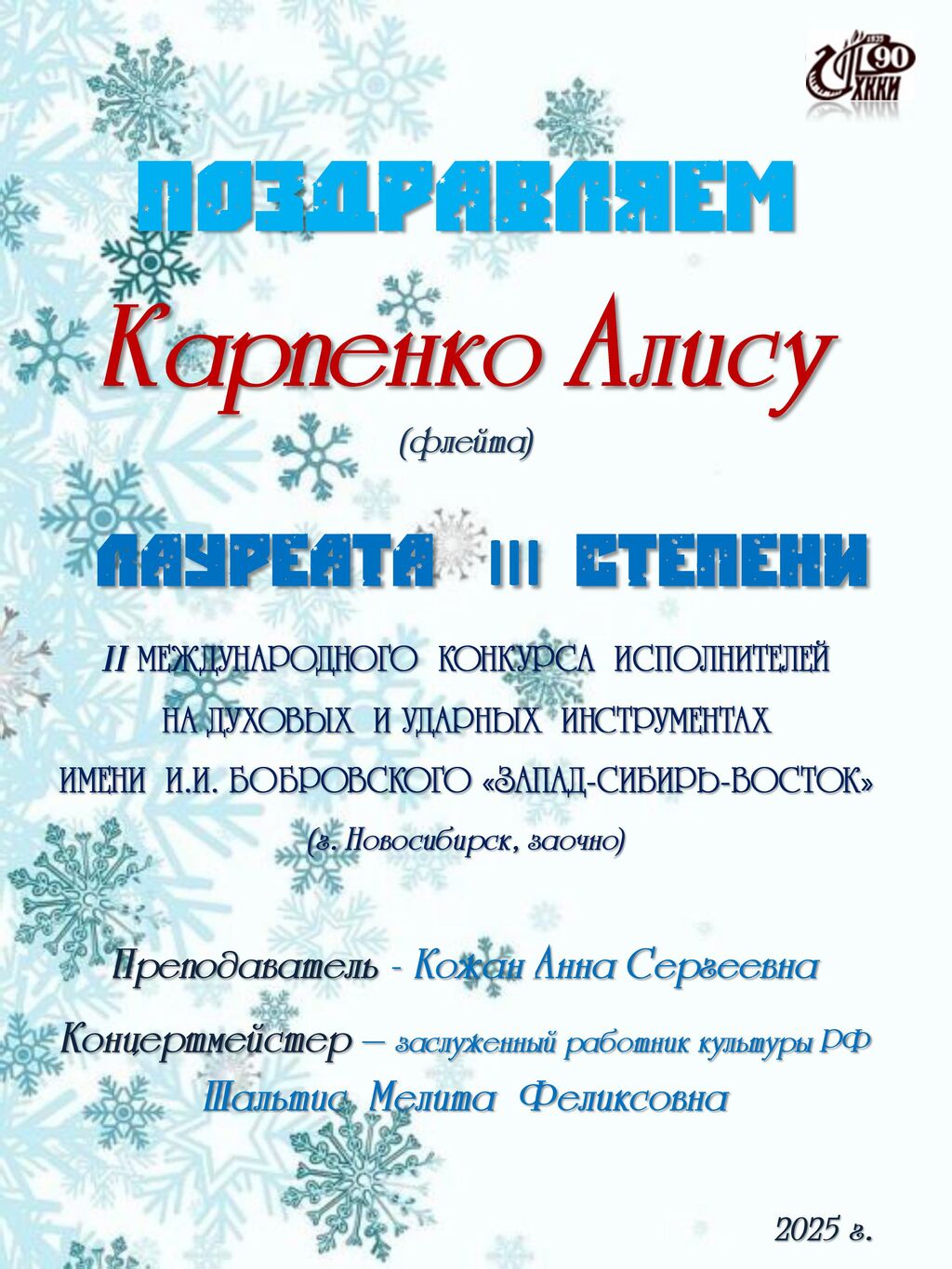 От всей души поздравляем Карпенко Алису с победой во II Международном конкурсе исполнителей на духовых и ударных инструментах имени И.И. Бобровскского «Запад‑Сибирь‑Восток»!