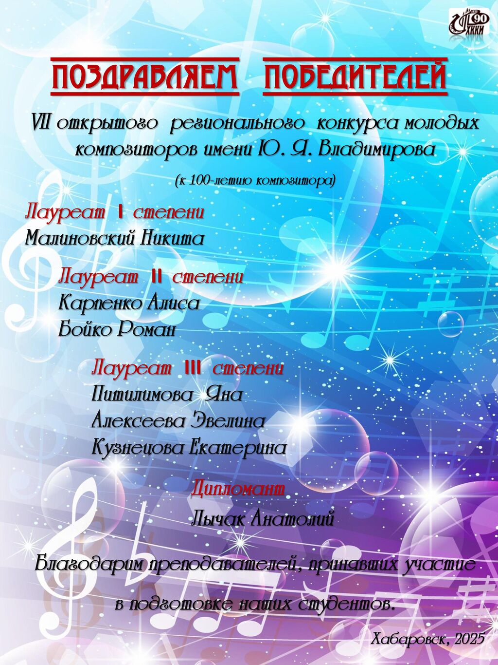 Поздравления победителям VII открытого регионального конкурса молодых композиторов имени Ю.Я. Владимирова
